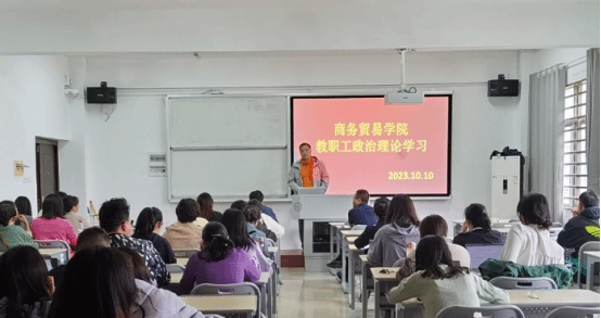 10月10日下午,商务贸易学院在博文楼5602教室开展10月全体教职工政治理论集中学习。会议由学院党总支部书记段可主持。