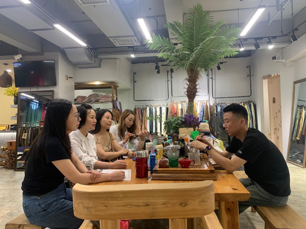 随后,在株洲市服饰(纺织)产业链联合会党委书记杨政、联合会秘书何海莲的陪同下,调研团队参观了湖南素白服饰有限公司,并与董事长马乖进行了座谈。该公司是国家级国风原创女装产品开发基地,其产品连续三年登上中国国际时装周T型台。座谈会上马总详细介绍了公司在跨境电商领域的发展情况,包括公司产品在跨境电商出海方面的尝试以及遇到的问题。双方就株洲服饰企业在跨境电商出海过程中面临的挑战进行了深入讨论,学院代表结合实际情况为素白服饰提供了针对性的建议,并共同探讨了跨境电商人才培养模式。杨政书记表示,希望未来商务贸易学院能够与株洲服饰企业深化合作,推动跨境电商领域的人才培养,助力株洲服饰企业走向国际市场。