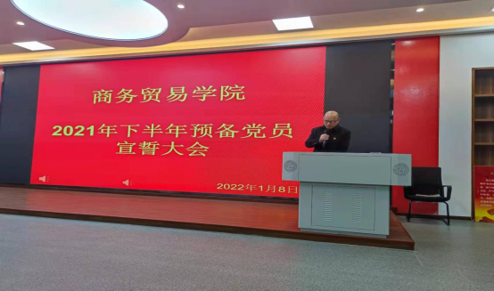 1月8日下午,商务贸易学院学生党支部在1101教室召开了2021年下半年预备党员宣誓大会,大会由学生党支部书记刘超老师主持,商务贸易学院学生党支部全体党员及77名预备党员参加了本次会议。