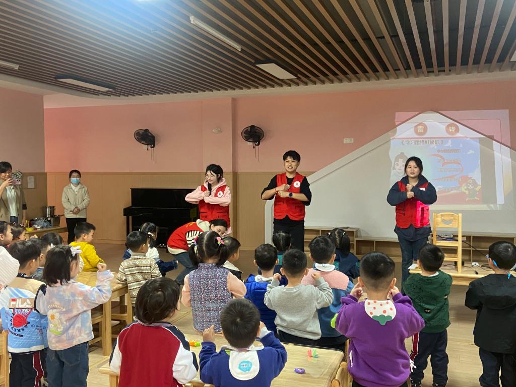 宣讲团成员们带领小朋友一起学唱《学习雷锋好榜样》手势舞歌曲,让小朋友们在歌声中感受雷锋精神的力量。青马社指导老师李玮羿为小三班赠送了红色故事绘本。