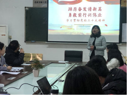备课会上,廖良、谭雅颖、朱紫罗三位老师分别就如何讲好“踔厉奋发谱新篇 勇毅前行兴伟业——学习贯彻党的二十大精神”专题做主题分享。廖良老师以学情调研切入,就如何融入时政热点、培养学生家国情怀、开展实践教学等进行分享。谭雅颖老师以最近很热的法治题材大剧《狂飙》为切入点,强化问题意识,突显育人价值导向。朱紫罗老师从教学对象、备课思路和疑难点等方面作了思路展示。
