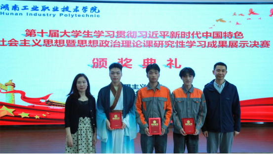 来自校内外的五位评委对文稿内容、展示汇报、特色创新等情况进行综合评审,最终决出一等奖2组、二等奖3组、三等奖5组。其中李芳佳老师指导的参赛小组作品《争当湖湘工匠 勇担青年使命》、王伟炫老师指导的参赛小组作品《国潮绽芳华 筑梦新时代》荣获一等奖,并代表我校参加湖南省第十届大学生学习贯彻习近平新时代中国特色社会主义思想暨思想政治理论课研究性学习成果展示竞赛。
