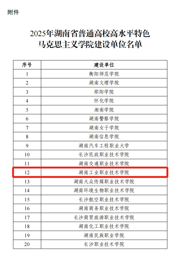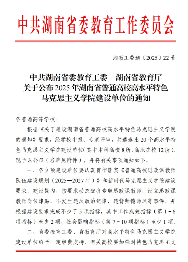 近日,省委教育工委、省教育厅联合印发《关于公布2025年湖南省普通高校高水平特色马克思主义学院建设单位的通知》,确定包含我校在内的20所高校为“高水平特色马克思主义学院建设单位”,为学校思政理论课教学质量提升、党的创新理论宣传和社会服务等方面搭建了良好平台。