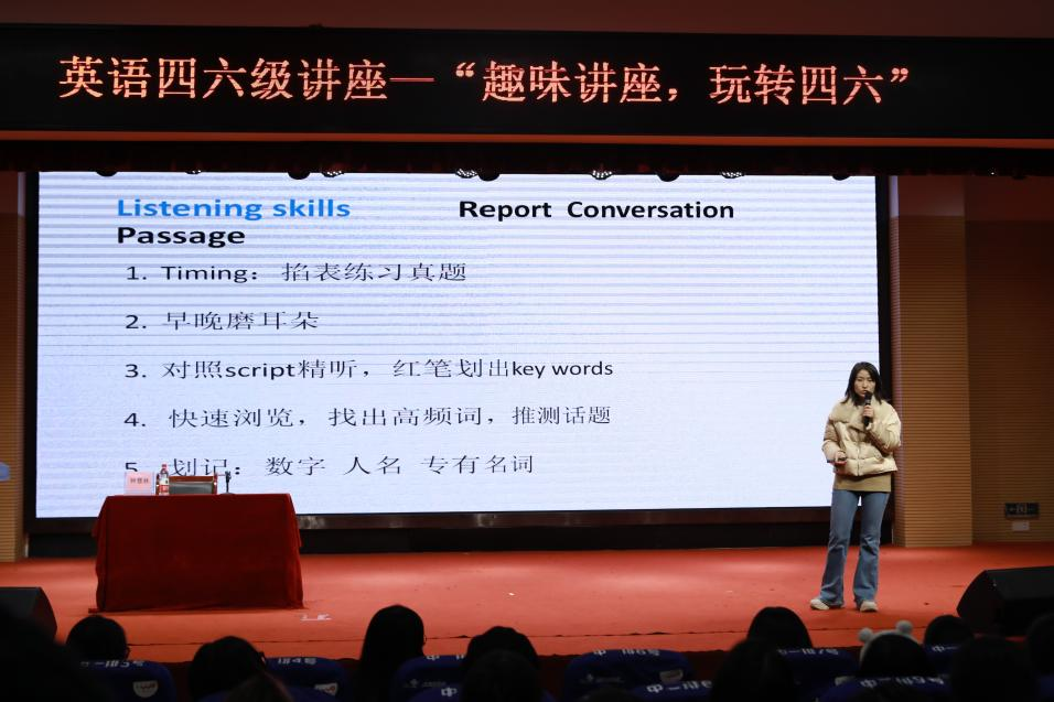 两位老师首先对英语四六级考试做了简单介绍,并从听、说、读、写四个方面进行了具体题型的技巧阐述。兰老师强调:“语感是培训出来的,技巧是练出来的,经验是不断总结出来的”。同时为了更好地解答同学们在备考中遇到的疑惑,讲座穿插了互动环节,同学们高涨的热情使现场的氛围轻松活跃。掌握一定的英语水平,不仅是提升自身综合素质的重要途径,更是顺利毕业和就业的关键因素,未来校学生会学风建设部将持续开展英语学习特色活动,推出大学英语综合能力提升系列专题讲座,有效帮助同学们明晰英语学习思路,满足多样化和个性化的学习需求。