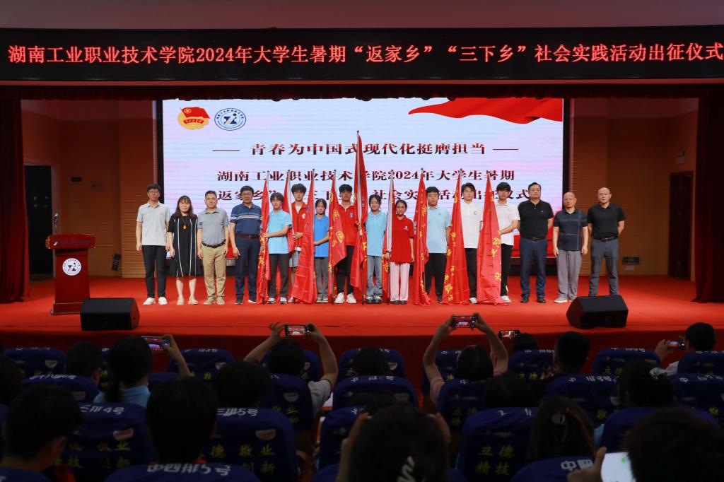 侯新华等出席仪式的领导为各实践团队授旗。侯新华作动员讲话。他强调,“返家乡”“三下乡”社会实践活动既是广大师生展现风采、服务社会的重要平台,也是当代青年大学生运用知识、施展才华、磨练意志和实践成才的大舞台。希望大家积极响应号召,积极投身青春的实践热潮,认真上好这堂“行走的青春思政课”。他向即将奔赴各地开展社会实践的老师和同学们提出了四点希望:一是发挥所学,增长才干。要抓住这次实践机会,紧紧结合自己的专业背景,把所学的书本知识与基层的丰富实践结合起来,锻炼自己面对困难解决问题的能力,在服务乡村振兴、地方经济建设、构建和谐社会的实践中提高自身素质,促进全面发展。二是敢于吃苦,不怕困难。要充分利用这次难得的机会,向农民和基层干部虚心请教、认真学习,用心去体验和感受真实的农村,感受农民群众对社会、对生活的态度,深切体会实现民族复兴、国家昌盛的历史紧迫感和责任感,把个人的抱负与国家社会的需求紧密结合起来,更加自觉地投入到学习实践中。三是严守纪律,安全第一。要牢牢树立“安全第一”的思想,始终把安全工作放在首位。在实践过程中要计划周详,准备充分,严守纪律,服从指挥。四是发扬传统,展现风貌。要发扬学校的光荣传统和优良校风,以实际行动展现工院师生积极进取,健康向上的精神风貌。
