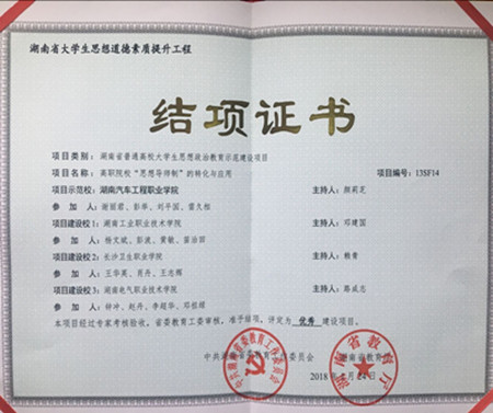近日,省委教育工委、湖南省教育厅下发了湖南省大学生思想道德素质提升工程结项证书,我校邓建国副校长主持参与建设的湖南省普通高校大学生思政政治教育示范建设项目“高职院校‘思想导师制’的转化与应用”圆满完成建设任务,经过专家考核验收,省委教育工委审核,准予结项,评定为优秀建设项目。