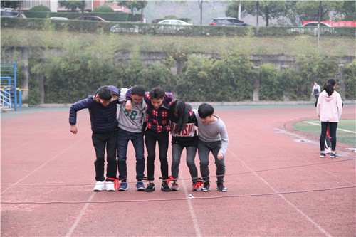 防艾跑活动以学院为单位,各个学院派出一支队伍作为本学院的代表,每只队伍由五个成员组成开展防艾接力跑。每队的首个队员从起点出发绕着田径场找到自己的队员,与队员一起把红丝带绑在腿上同行奔跑,依次奔跑接力到5位队员都同行后,在离终点五十米处,设置了不同高度的障碍,需要队员共同配合,齐心协力跨过障碍,奔向终点。