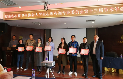 本网讯 11月24日至25日,湖南省心理卫生协会大学生心理咨询委员会第十三届学术年会在长沙召开。会议对湖南省高校年度先进单位和先进个人给予了表彰。我校荣获2017-2018年度湖南省高校心理健康教育先进单位;学校学生心理健康协会被评为湖南省高校优秀心理类学生社团,学校心理咨询中心杨迪禹老师、机械工程学院何科英老师荣获湖南省高校心理健康教育先进个人。