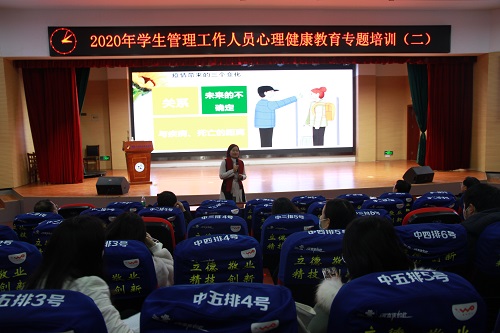 本网讯 12月29日下午,学生管理工作人员心理健康专题培训在我校大学生活动中心举行,心理学博士、中南林业科技大学袁红梅教授做《高校高关怀个案访谈技术》专题讲座,学生生工作处、校团委、招生就业处、保卫处等部门负责人及相关工作人员,各二级学院党总支书记、全体辅导员、班主任等200余人聆听,学生工作处副处长彭波主持活动。