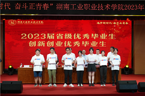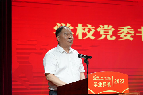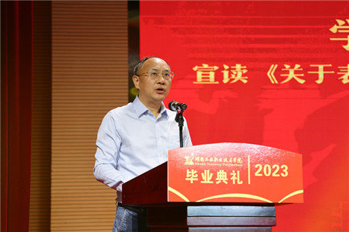 刘建湘代表学校向圆满完成学业的同学们表示热烈的祝贺,向辛勤培育同学们成长成才的广大教职工致以崇高的敬意。他回顾了与同学们在工院携手走过的非比寻常、极其难忘的三年,细数了同学们在技能大赛中摘金夺银,在体育赛场上载誉而归,在志愿服务中砥砺成长,在乡村振兴中担当作为的奋斗故事。他亲切寄语广大学子,同学们正身处伟大时代,肩负光荣使命,即将踏上青春征途,希望大家心怀“国之大者”,成就强国梦想;弘扬工匠精神,干出不凡业绩;永葆进取之心,矢志勤勉奋斗,继续秉承工院优良传统,传承楚怡职教精神,在未来的人生道路上不惧风雨、破浪前行。