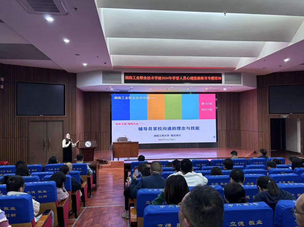 11月6日上午,学校在图书馆多功能报告厅开展了题为“辅导员家校沟通的理念与技能”心理健康教育专题培训。培训邀请到湖南工商大学心理中心主任戴吉博士担任主讲。各二级学院党总支书记和副书记、全体辅导员和班主任、学工部全体成员共140余人参加,培训会由学工部部长段可主持。