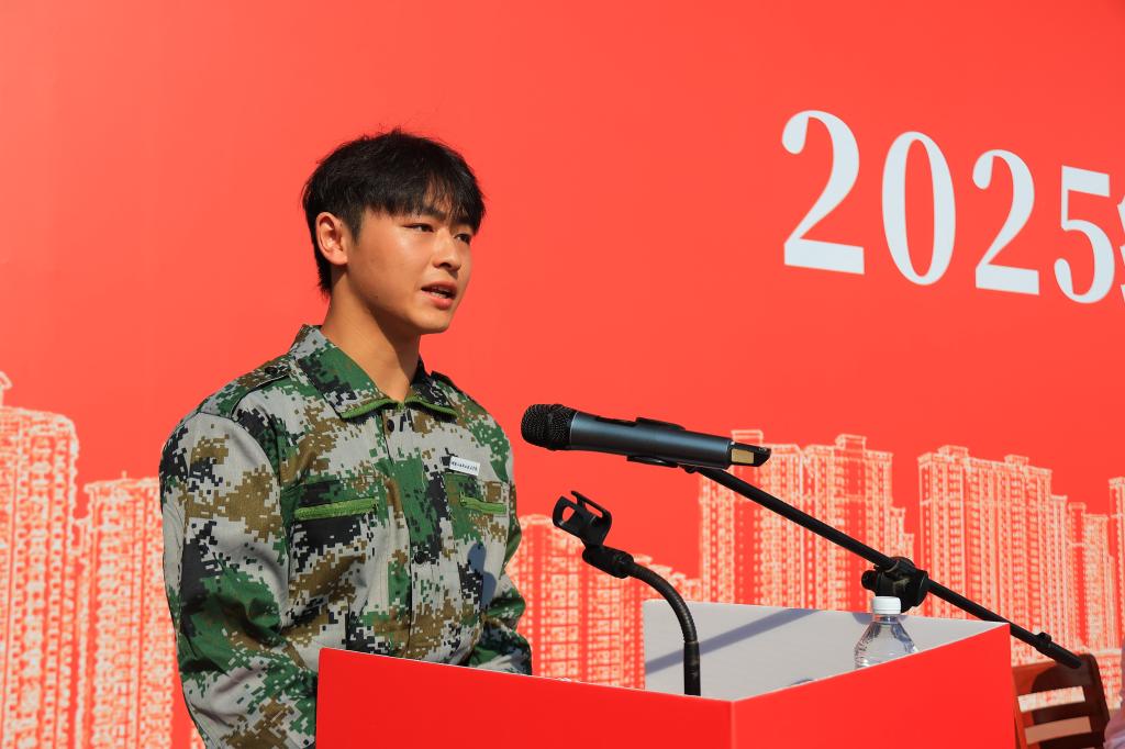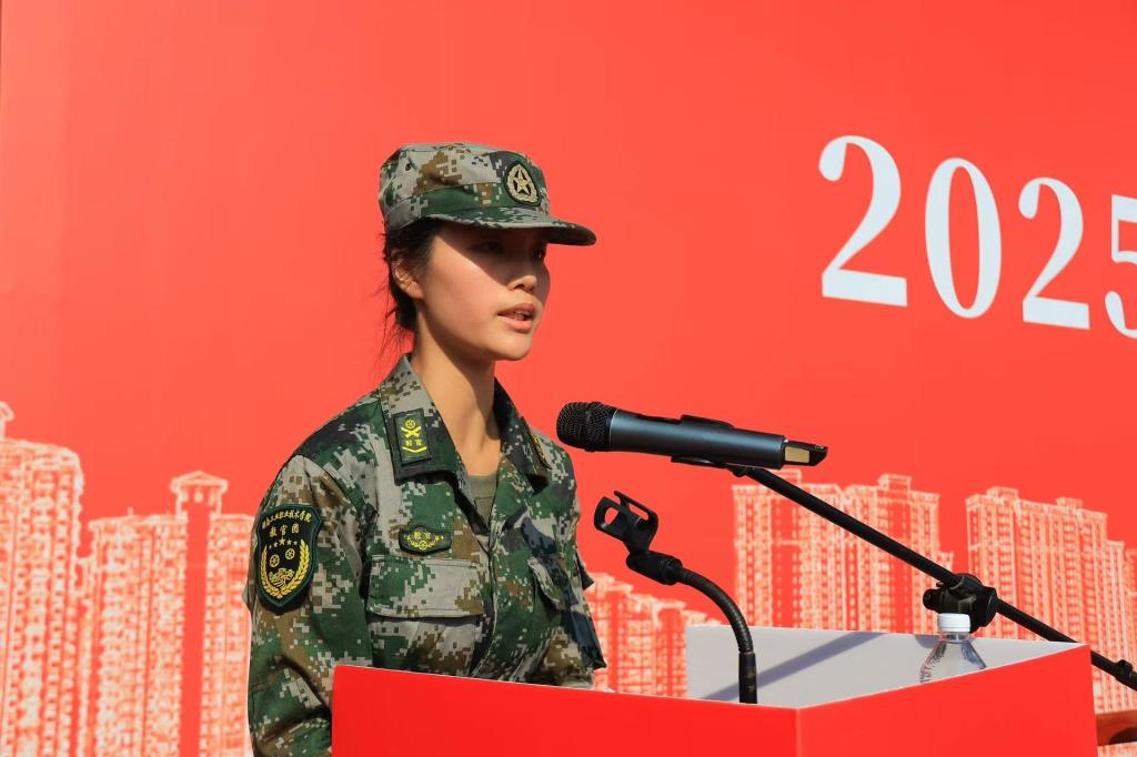 军训教官代表李雯君在典礼上发言。“军训是同学们进入校园的第一堂课,也是一堂青春必修课。期待同学们在军训中主动磨砺、成就自己。”她表示将以良好的形象组织军训、以过硬的素质抓好军训、以严谨的作风检验军训。