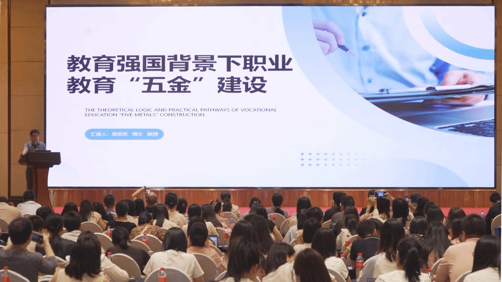在主旨报告环节,学校教务处处长周哲民以《教育强国背景下职业教育“五金”建设》为题进行发言,从建设背景、内涵特征、建设路径等多维度介绍职业教育“五金”建设的新理念、新模式和新机制,提出未来要精准对接国家战略、重点产业、区域发展、个人终身发展需求,打破“以教论教”传统路径依赖,完善“以产引教、以产定教、以产改教、以产促教”的体制机制,系统推进“五金”建设改革。