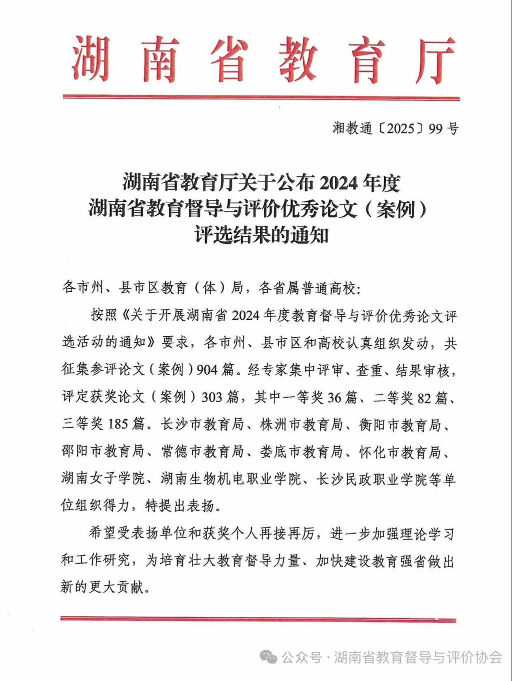近日,湖南省教育厅发布《2024年度湖南省教育督导与评价优秀论文(案例)评选结果的通知》(湘教通〔2025〕99号)。本次评选活动征集参评论文(案例)904篇,评定获奖论文(案例)303篇,我校荣获一等奖1篇,三等奖2篇,位居省内高职院校前列。