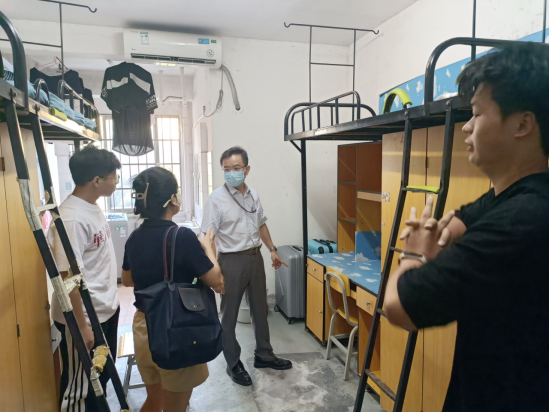 党总支书记廖佑莲和辅导员范小雨、肖高贤一同深入十一栋和十栋寝室,认真查看了新生们的宿舍入住情况,亲切地与学生交流。她鼓励新生以积极的心态尽快适应大学校园生活,提醒新生要注意宿舍用电、防诈骗、人身财物安全等问题,叮嘱新生要做好疫情防控,要将疫情防控工作常态化,坚持健康打卡,注意日常寝室与个人卫生,有特殊情况及时向辅导员班主任或学院反映。