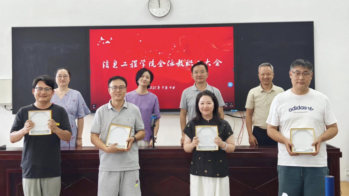 9月10日,正值第四十一个教师节,信息工程学院在敏行楼101室举行了一场温馨而庄重的表彰仪式,学院领导班子为郭艳、蒲骁旻、刘韬、杨幸4位老师颁发了“在院从教二十年”纪念杯,以致敬其长期以来的辛勤耕耘与卓越贡献。全院教职工共同见证了这一荣誉时刻。