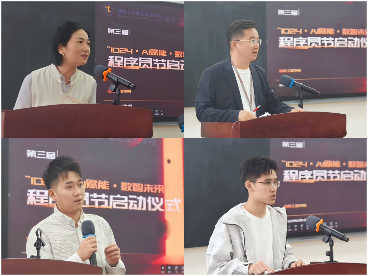 信息工程学院院长王世峰在开幕辞中着重指出,AI技术正深刻地重塑未来,他鼓励师生以“程序员节”为契机,深入开展技术实践,勇攀数智化高峰。长沙曦淳信息技术有限公司经理胡建国作为企业代表致辞,他高度肯定了学院的办学成果,并表达了对校企合作培养数智人才的期望。软件协会会长谢晓鹏同学作为学生代表发言,他分享了对技术的热爱与憧憬:“代码是改变世界的语言,我们将以本次程序员节为起点,运用智慧探索AI的无限可能。”
