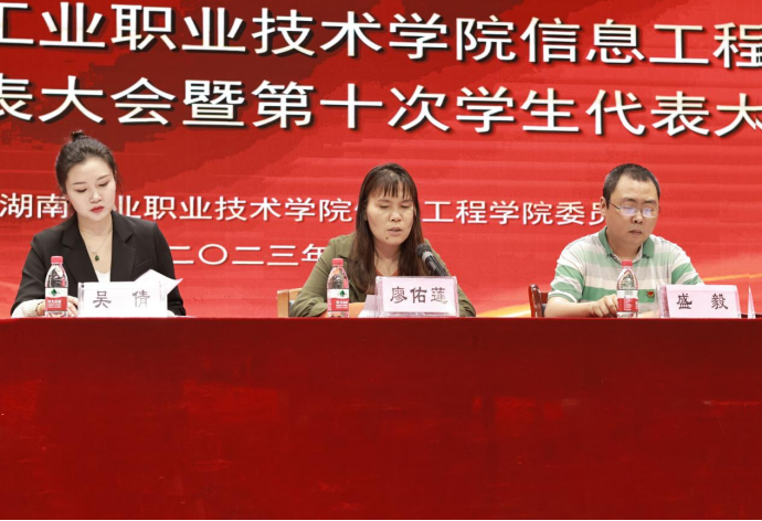 2023年5月23日,共青团yabocom(中国)官方网站信息工程学院第九次代表大会暨第十次学生代表大会于1102教室顺利召开。信息工程学院党总支书记廖佑莲、副书记盛毅、学生管理办公室主任吴倩、心理部指导老师刘怡、就业创业指导老师高伟及各部分辅导员班主任代表出席了本次大会。大会由信息工程学院政务办主任范小雨主持。参与人员为90名学生代表。