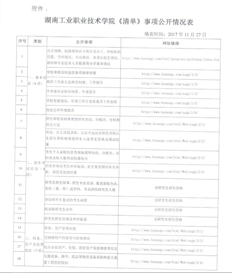 学校主动公开了2017年单独招生简章、2017年招生指南、2017年中加国际招生简章、新生入学须知、湖南省录取名单和咨询渠道等情况,确保学校单独招生和普通高考招生工作有序进行,通过学校网站及时向社会公开了各项招生录取政策,包括《关于做好2017年我省高职院校单独招生工作的通知》、《湖 南工业职业技术学院2017年单独招生简章》、《湖南省 2017年普通高等学校招生工作实施办法》等招生信息。