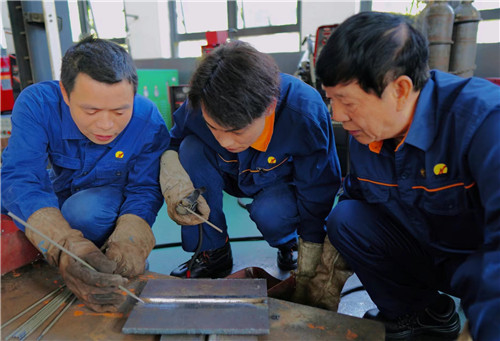 艾爱国(右一)、欧勇(左一)示范焊条电弧焊的操作技巧