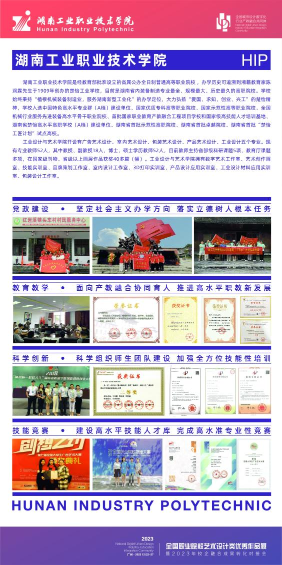 12月24日至26日,由教育部职业院校艺术设计类专业教学指导委员会主办的全国职业院校艺术设计类优秀作品展暨 2023年校企融合成果转化对接会在广州琶洲·灵感创新展馆举行,全国共有86所高职院校、10家企业参加此次成果转化对接会,yabocom(中国)官方网站工业设计与艺术学院受邀参加展会,展会中关于湖南工业职院匠心创设中心在对口帮扶龙山县红岩溪镇头车村 “党建引领 精准施策”为主题的乡村振兴项目—湘西红岩溪镇头车村文创产品设计案例,获得了参展人员一致好评,其中相关成果转化设计作品及精准扶贫志愿服务项目受到高度赞扬。