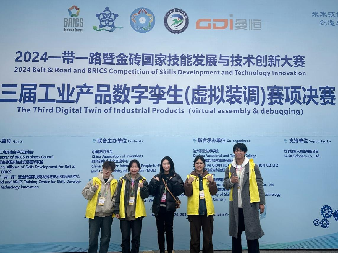 2024年12月20日,2024“一带一路”暨金砖国家技能发展与技术创新大赛之第三届工业产品数字孪生(虚拟装调)赛项决赛在达州职业技术学院圆满收官。来自全国11个省(市)46支队伍共92名选手展开了激烈的竞争。工业设计与艺术学院师生在比赛中获得1项二等奖、1项三等奖、优秀指导教师奖,以及优秀组织奖的好成绩。
