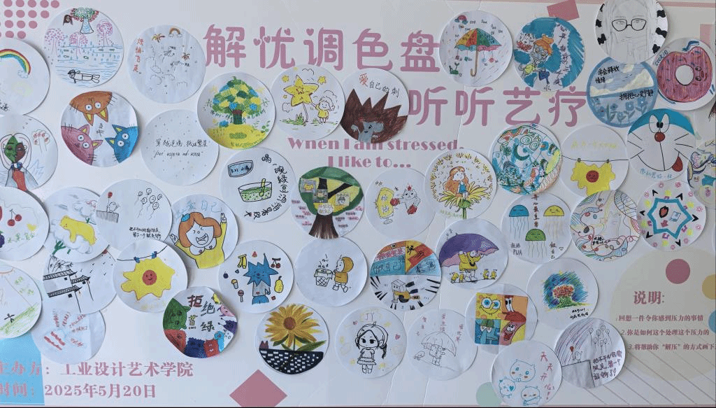 活动现场,参与者在轻松愉快、充满创意的氛围中自由创作。老师引导学生把内心的“压力”通过绘画的方式呈现出来,学生在艺术表达的过程中感受压力,释放情绪。师生们尽情享受活动的过程,带着“私人订制”的作品与心灵收获满载而归。