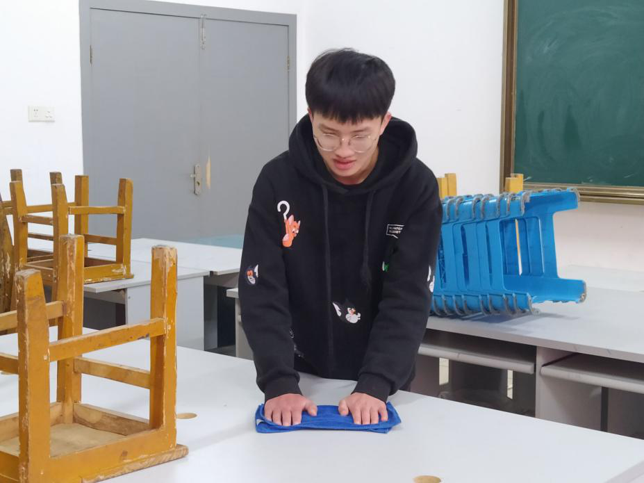 新学期开始,尘封许久的教室早已遍布灰尘,整体凌乱。同学们在到达教室后立刻进行有序分工,男生主要负责拖地扫地,女生主要负责抹桌子,细心的打扫着每一个角落,互相配合,彰显出不怕苦不怕累的奋斗精神和朝气蓬勃的精神面貌。通过大家的努力,原本脏乱的教室地面干净如新,桌椅摆放整齐,整体面貌焕然一新。