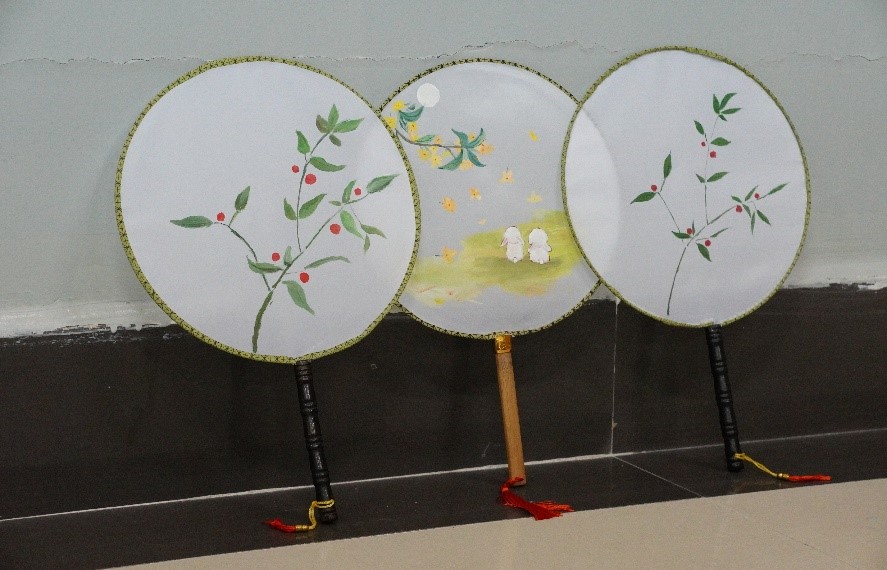 同学们怀着对老师深深的敬爱,结合自己对中秋佳节的感悟和对传统图案的理解,精心选择心仪的图案纹样,小组讨论赋予纹样新的创作内涵,设计并制作出新颖的扇面作品。