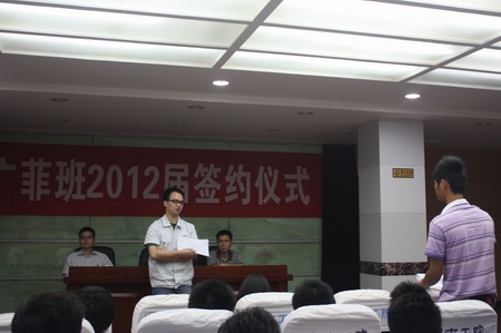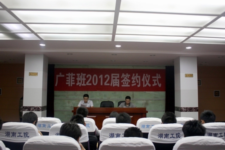 5月31日下午,广菲班2012届签约仪式在办公楼第一会议室举行。机械工程系相关负责人、广汽菲亚特集团项目经理及人事部工作人员、广菲班班主任等出席签约仪式,40名广菲班学员参加了签约仪式。