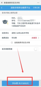 4、学生登录后,在下方会统计该缴费类型的合计数(5000),点击下面“学杂费共计5000元”即可缴费。(需全额缴费)