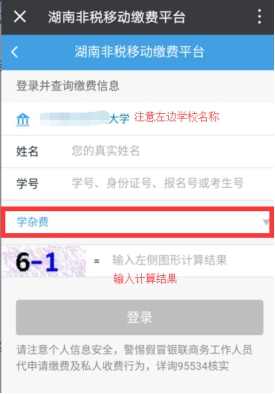 3、然后进入登录界面,输入学生姓名、学号栏必须输入身份证号,缴费类型默认为学杂费不用更改。