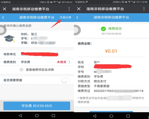 5、缴费记录查询:在学生登录后,点击右上角的“交易记录”。