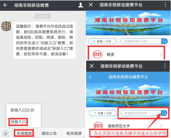 进入公众号,点击“在线缴款”—》“旧版入口”-》“教育”—》“选择湖南工业职业技术学校”。