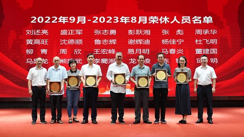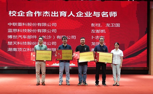会上展示了获得2022-2023年省部级及以上荣誉的先进集体及个人名单,表彰了校企合作育人杰出企业及育人导师。副校长谢希钢为校企合作育人单位和个人导师代表颁发奖牌和证书,中联重科股份有限公司等十家企业,彭柱等十位老师接受表彰。