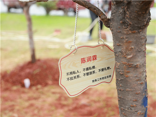 “私德为立身之本,公德为服务社会国家之本。——陶行知”随后,党员同志在每棵树上悬挂了一块树牌,上面写有名人关于廉洁的语录,或对廉、勤、俭、清等字的说文解字,让过往师生在潜移默化下将廉洁自律意识铭记于心。